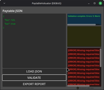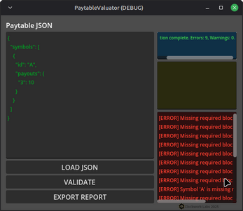 Paytable Valuator validates the following required top-level JSON blocks: