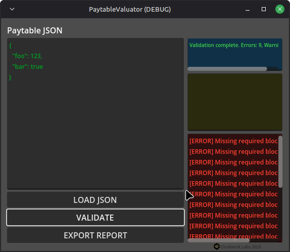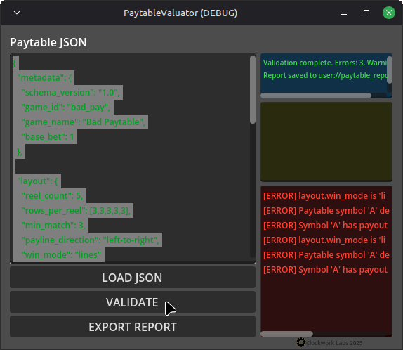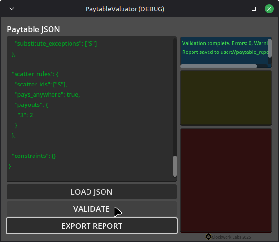 Paytable Valuator (Clockwork Labs) is a professional validation tool designed for developers building slot machines, gambling-style games, and reel-based systems.